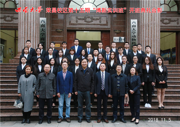 2018年11月5日,西南大学第十五期“博新实训”班开班典礼暨开班第一讲在荣昌校区2309会议室隆重举行,西南大学荣昌校区管委会主任左福元、成都思来生物科技有限公司董事长王峰、西南大学荣昌校区管委会副主任赵智华、西南大学荣昌校区教务主任曾仁权等领导出席开班典礼。